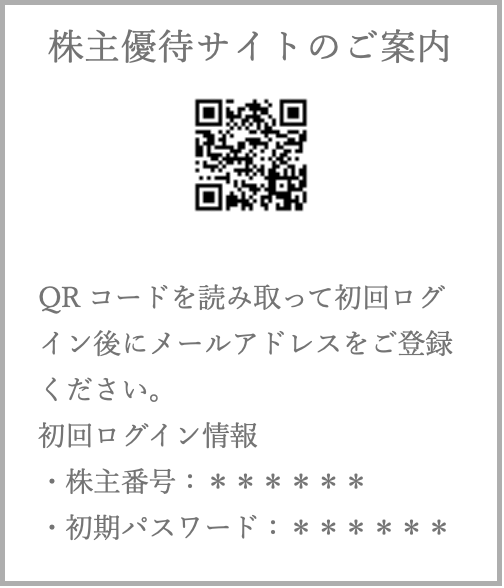 配当金関連書類とともに同封されるご案内状に印字されたQRコード※ をスマートフォン等で読み取り、書面に記載の方法で株主優待サイトにログインし、必要情報をご登録ください。
