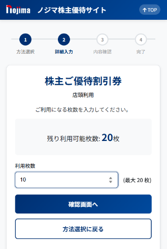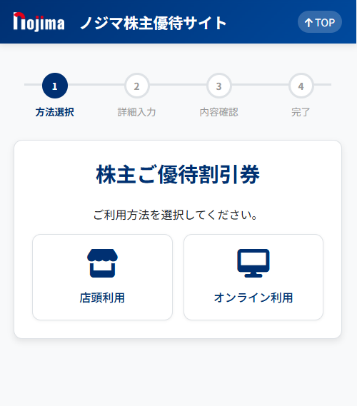 ③各種優待券を選択し、画面の案内に従って進みます。店頭利用とノジマオンライン利用が可能です。