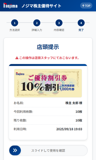 店頭利用時は、株主優待サイトにログインし、表示される電子チケットをスタッフに提示することでご利用いただけます。ご利用方法の詳細についてはご案内状をご確認ください。