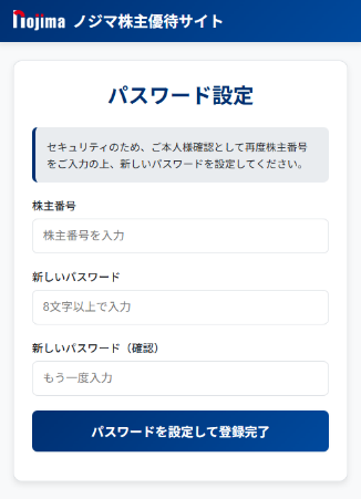 ⑤メール内のURLにアクセスし、再度株主番号を入力し、新規パスワードを登録してください。