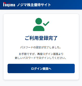 ⑥初期登録完了となり、株主優待サイトをご利用になれます。完了画面が表示されたらログイン画面へ戻ります。
