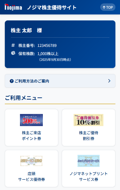 | 1,000株以上 | 株主優待割引券(最大1,000円):50枚×年2回 株主来店ポイント券(500ポイント):12枚×年2回 店頭サービス優待券:2枚×年2回 ノジマグループオリジナル商品×年1回 |