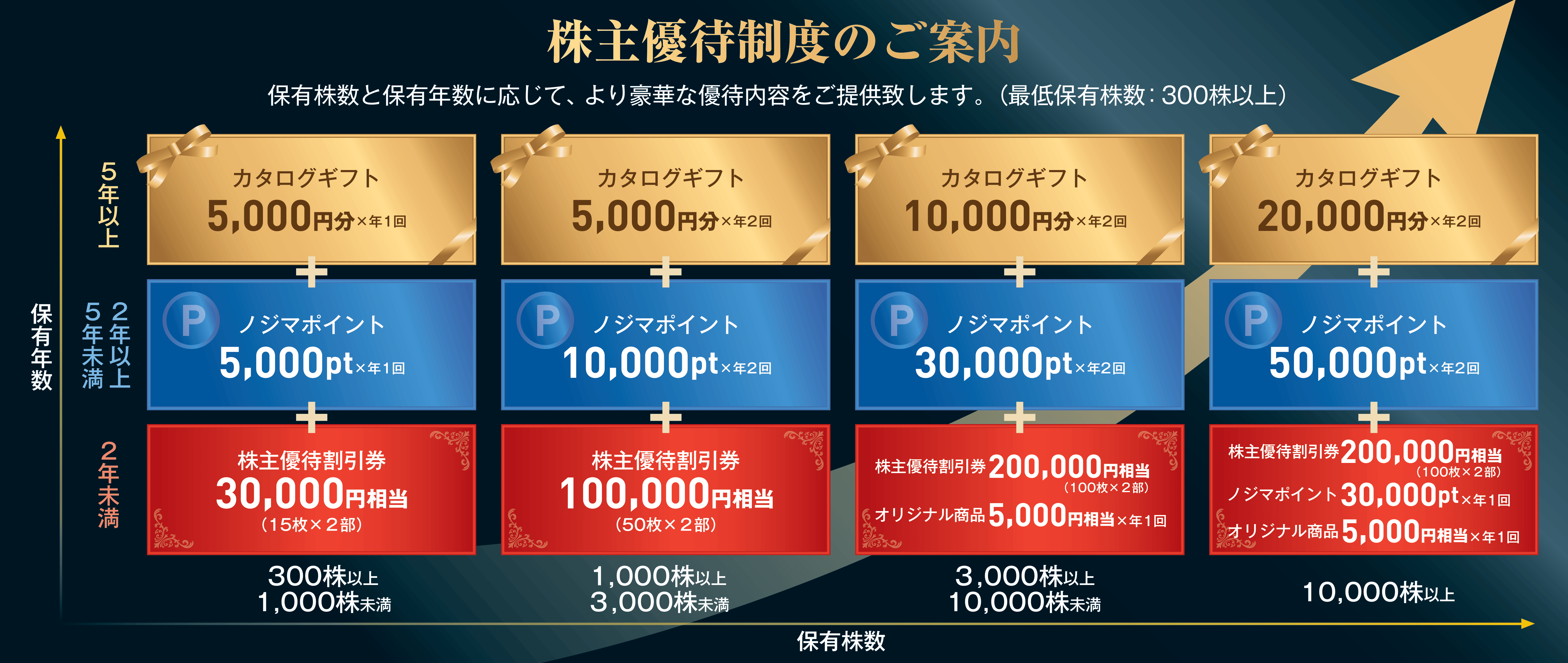 | 1,000株以上 | 株主優待割引券(最大1,000円):50枚×年2回 株主来店ポイント券(500ポイント):12枚×年2回 店頭サービス優待券:2枚×年2回 ノジマグループオリジナル商品×年1回 |