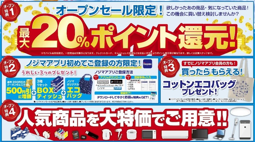 株式会社ノジマ(神奈川県横浜市 代表執行役社長 野島廣司 以下「ノジマ」)は、「ノジマイオンモール北戸田店」を「ノジマ 戸田駅前店」より移転オープンし、11月14日(金)~12月5日(金)の期間中、限定特価としてノジマポイントが20%還元になるお得なセールを開催いたします。地域最大級のショッピングセンターであるイオンモール北戸田にて、より便利に生まれ変わったノジマにぜひお越しくださいませ!