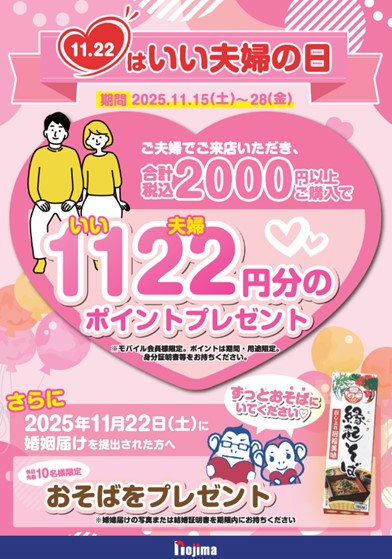 株式会社ノジマ(神奈川県横浜市、代表執行役社長・野島廣司)では、11月22日(土)の「いい夫婦の日」に合わせ、ご夫婦でご来店かつお買い物いただいたお客様に「1,122ポイント」をプレゼントするキャンペーンを実施中です!さらに11月22日に入籍されたお客様には、末永く「そば」にいられるよう「おそば」もプレゼントさせていただきます。
