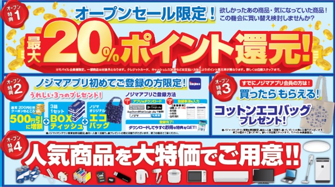 また、ノジマでは11月21日(金)~12月12日(金)の期間中、オープン限定特価としてノジマポイントが20%還元になるお得なセールも開催いたします。皆さまのご来店をお待ちしております!
