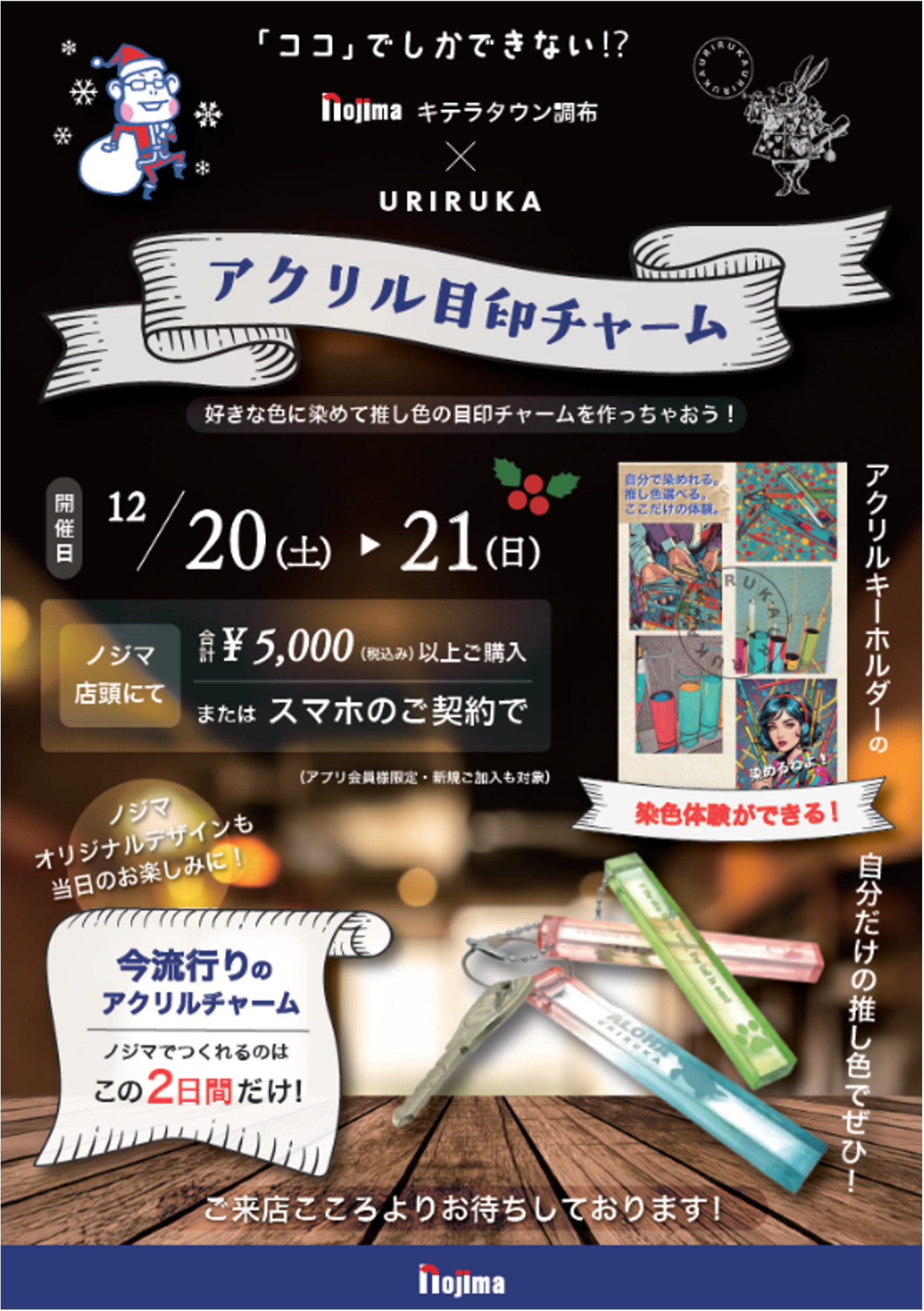 ノジマ キテラタウン調布店では、「アクリル工房uriruka」とのコラボレーションによるアクリル染色体験イベントを12月20日(土)・21日(日)に開催いたします。家電やスマホのお買い物のあとは、キラキラ光るアクリルキーホルダーでクリスマスの思い出を彩りませんか?皆様お誘い合わせの上、ぜひ店頭にお越しくださいませ!
