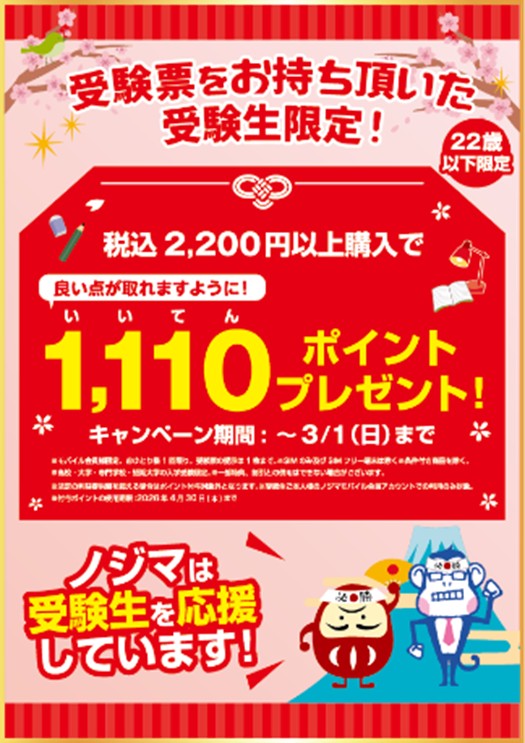 株式会社ノジマ(神奈川県横浜市、代表執行役社長・野島廣司)では、受験生を対象に「1,110(良い点)」ポイントをプレゼントするキャンペーンを実施中です。当初スマホもしくはスマホ関連商品をご購入の受験生を対象にキャンペーンを開始しましたが、より多くの受験生を応援するべく、1月24日(土)より対象を大幅に拡大し、スマホ以外の商品でも税込み2,200円以上のご購入でポイントをプレゼントします。また、キャンペーン期間を3月1日(日)まで延長いたします。現在新生活応援フェアも開催中のため、新入学や新生活準備についてノジマにお気軽にご相談ください。