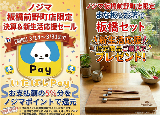 ノジマ 板橋前野町店では、3月14日(土)より決算&新生活応援セールとして板橋区のデジタル地域通貨「いたばしPay」をご利用いただくとお支払金額の最大5%分をノジマポイントで還元するキャンペーンを実施します。さらに板橋区で新生活を始める方には対象の家電ご成約で「板橋」にちなんで「まな板」と「はし」のセットをプレゼントします。板橋で良いスタートが切れるようノジマスタッフが新生活準備を最大限サポートさせていただきますのでぜひ店頭にお越しください。