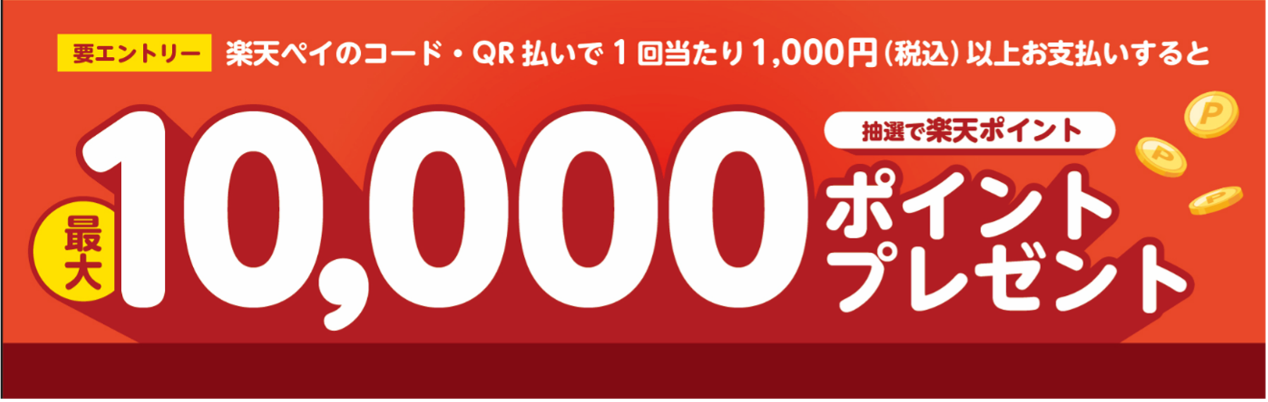キャンペーン期間中にエントリーのうえ、対象店舗にて「楽天ペイ」で1,000円(税込)以上のコード決済をした方の中から抽選で「楽天ポイント」を進呈します。