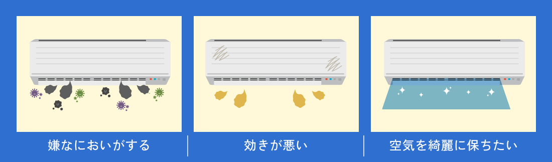 エアコンはお部屋全体の空気を循環させているため、内部に生えた見えないカビや溜まったホコリをそのまま吸ってしまっている可能性があります。たとえフィルター掃除機能付きの機種であっても、内機の奥には手の届かない汚れが蓄積してしまうのが実情です。
