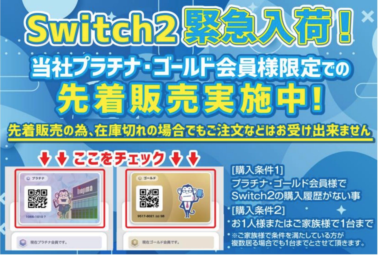 Nintendo Switch2につきましては、今現在当社プラチナ・ゴールド会員様限定で先着販売を実施しております。