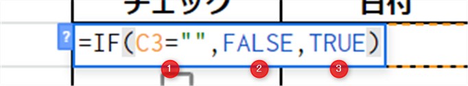 2.真の場合の値は、セルが空白(日付が入力されていない)の時はチェックを入れないので、FALSE