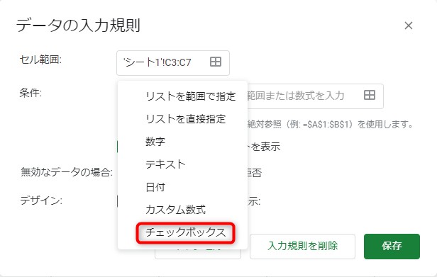 データの入力規則が開いたら、条件を「チェックボックス」に変更します。
