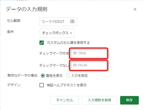 「カスタムのセル値を使用する」にチェックを入れると、その下に「チェックマーク付き」「チェックマークなし」の項目が開き、それぞれに値をつけることができます。