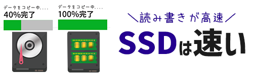 SSDはHDDに比べ、読み書きの速度が速いのが魅力です。耐久性や消費電力にも優れるので、高速でデータの読み書きを行いたい方に、SSDがおすすめです。