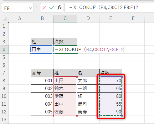 今回はB4セルにリストを作成しているので、リストから姓を変更すれば、それに対応した点数を検索できます。