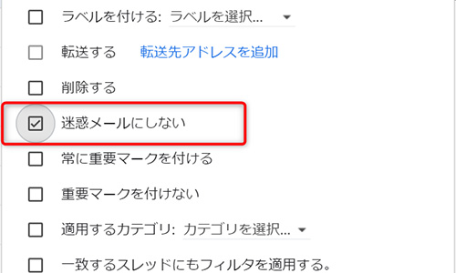 「迷惑メールにしない」にチェックを入れて、「フィルタを作成」をクリックすれば、該当のアドレスからのメールを迷惑メールにしないことができます。