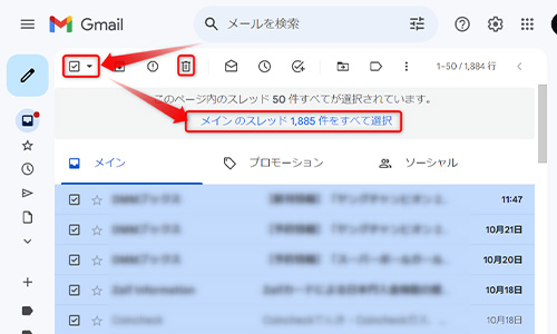 また、「メイン のスレッド ○○○○件をすべて選択」をクリックすれば、受信トレイにあるすべてのメールを一度に選択できます。
