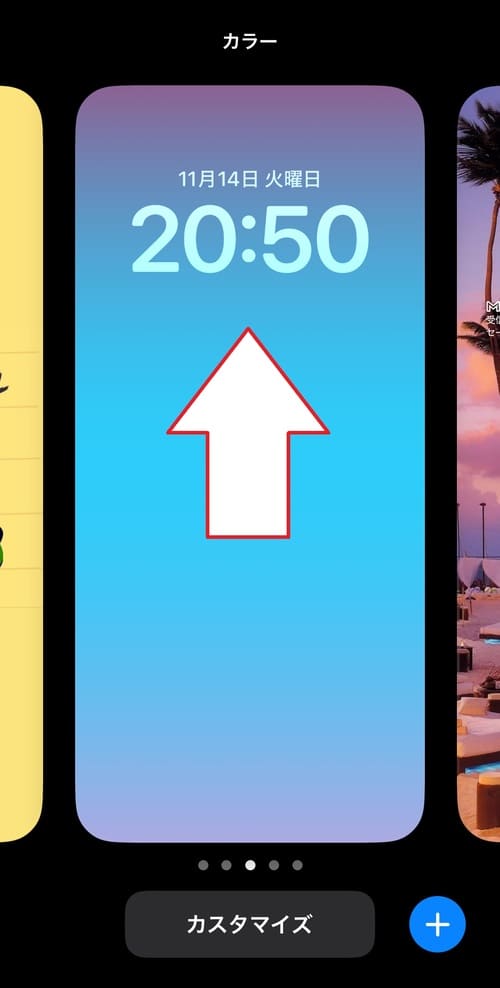 ロック画面の任意の場所を長押しし、壁紙の選択画面を開きましょう。壁紙の選択画面を開いたら、変更したい壁紙の下にある「カスタマイズ」をタップしてください。