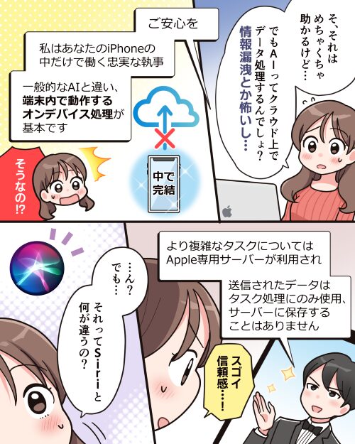 Apple Intelligenceの設定方法や具体的な使い方を解説しましたが、Apple Intelligenceはプライバシー重視の設計が魅力のAI機能です。