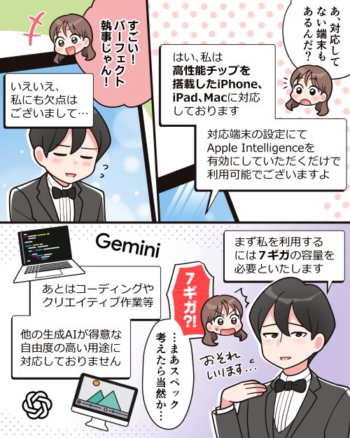 使用している端末のOSが古い場合、Apple Intelligenceは利用できません。また、Apple Intelligenceに対応している機種である必要があります。