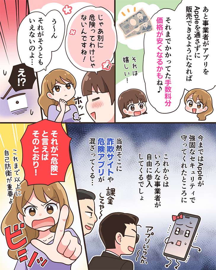 これまではAppleなどの事業者が厳しい審査を行うことで安全を確保してきましたが、プラットフォームが開放されると、有害なソフトウェアや偽アプリにアクセスしてしまう可能性が高まります。