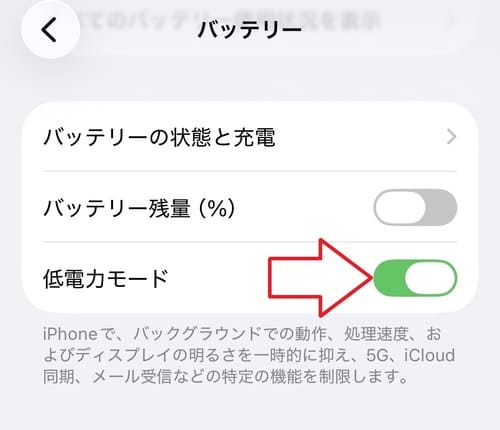 そのため、バッテリーを長持ちさせるために日常的に低電力モードをオンにしている方は、動作の重さにつながっている可能性があるでしょう。