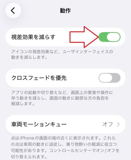- 「視差効果を減らす」をオンにすると、iPhone操作時のエフェクトが抑えられます。