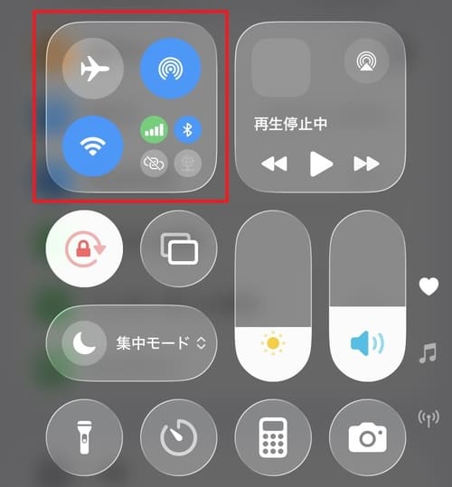 - 画面の右上から下方向にスワイプしてコントロールセンターを表示させたら、左上にあるネット関連のアイコン一覧をタップします。