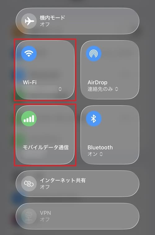- 「Wi-Fi」または「モバイルデータ通信」ボタンをタップし、接続のオン・オフを切り替えます。