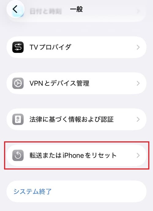 - 画面をスクロールし、「転送またはiPhoneをリセット」をタップします。