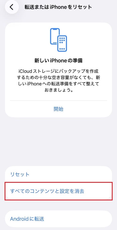 - 「すべてのコンテンツと設定を消去」をタップし、案内にしたがって初期化設定を行いましょう。