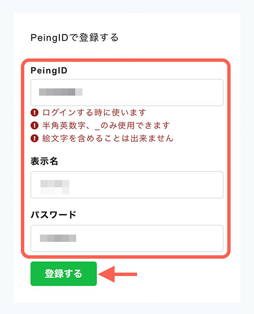規則に従ってPeingID、パスワードを設定しましょう。 「表示名」は質問箱に表示される名前です。