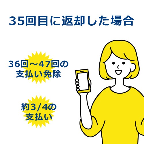 - 36回目返却時支払い総額 = 2444円 × 23回 + 55,440円 ÷ 2 = 83,932円(25%OFF)